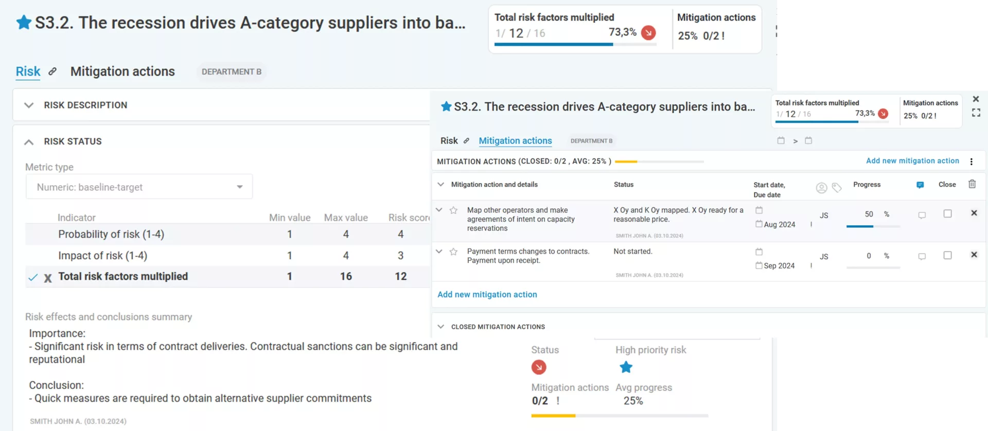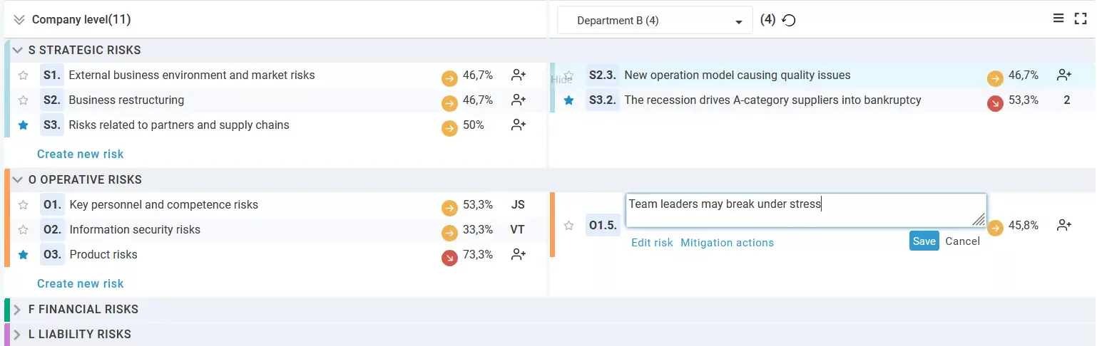 Effortlessly identify and assign risks bottom-up or top-down by risk category across organizations and processes. The identification makes risks visible and accumulates under company's key risk categories and topics. Risks identified are broken down into clear and manageable risk structure.
