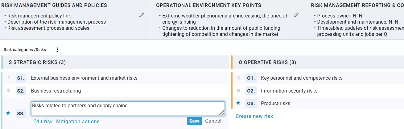 Set categories like strategic business risks, operational risks etc. Select suitable risk topics for your organization that drive and assist in identifying risks across the organization.