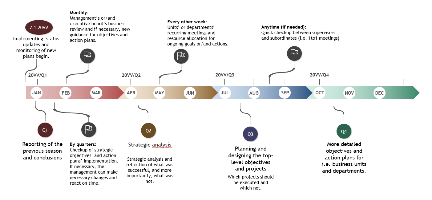 Remember to take the real calendar’s limitations (annual leaves, national holidays) into account when planning the annual framework. The planning should start early before the calendar year changes or the financial statement of the ongoing season is published. Thus, implementing the strategic objectives and action plans can be started and executed effectively.