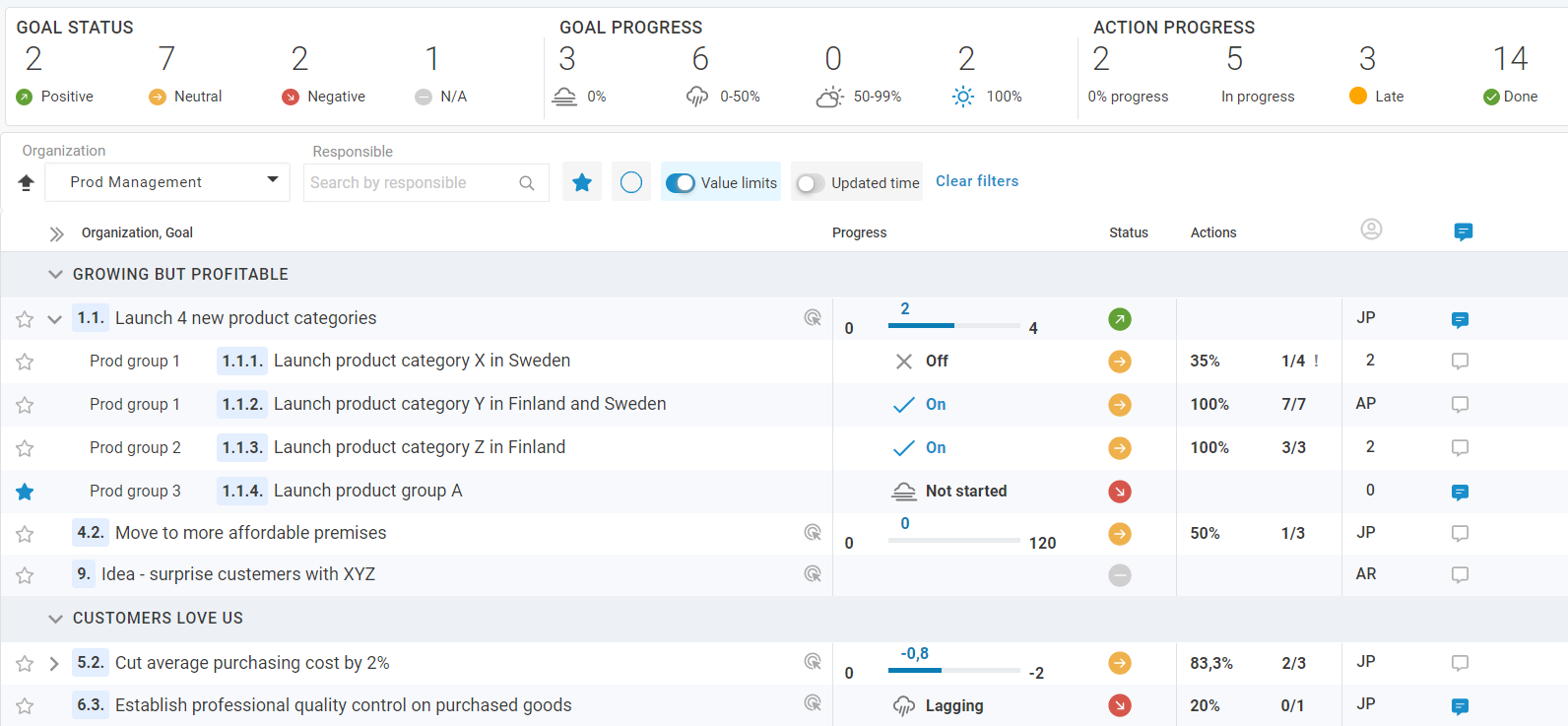If needed explore more details by focus area, business units, goal chain, action plan, person, priority or check only red ones that are at risk. New goals and to-dos can be inputted, shared and instructed directly to the right people through LATO. Managers can lead their team and facilitate their goal and action success.