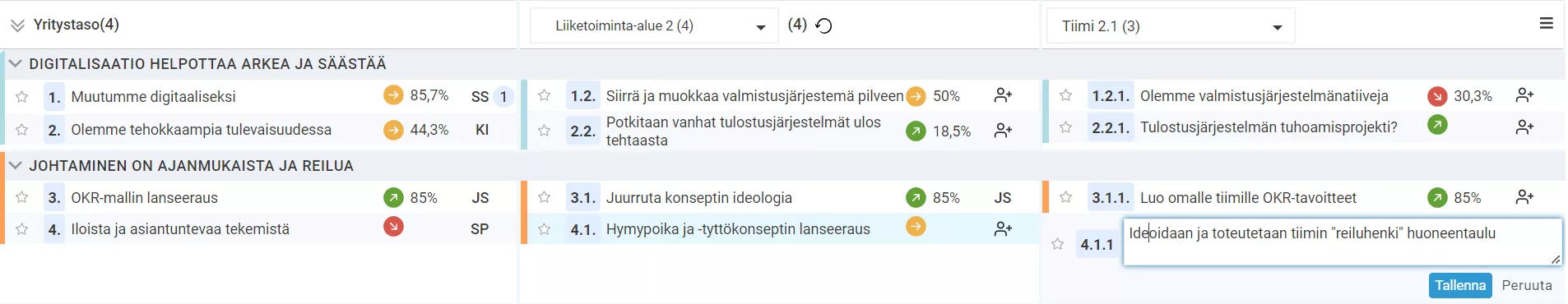 Vastuualueiden ja tiimien OKR tavoitteiden ja avaintulosten laatiminen on helppoa ja nopeaa. LATO ohjaa käyttäjät oikeaan kohtaan johtamisrakennetta. Luo omat tavoitteet ja avaintulokset Drag-&-Drop menettelyllä suunnittelua ohjaavassa strategisten valintojen ja tavoitteiden raamissa. Vastuuta, tägää aihetunnisteita ja täydennä tarkentavat suunnittelutiedot. Käytä myös simppeleita kuvaavia edistymämittareita numeeristen avaintulosten ohella.
