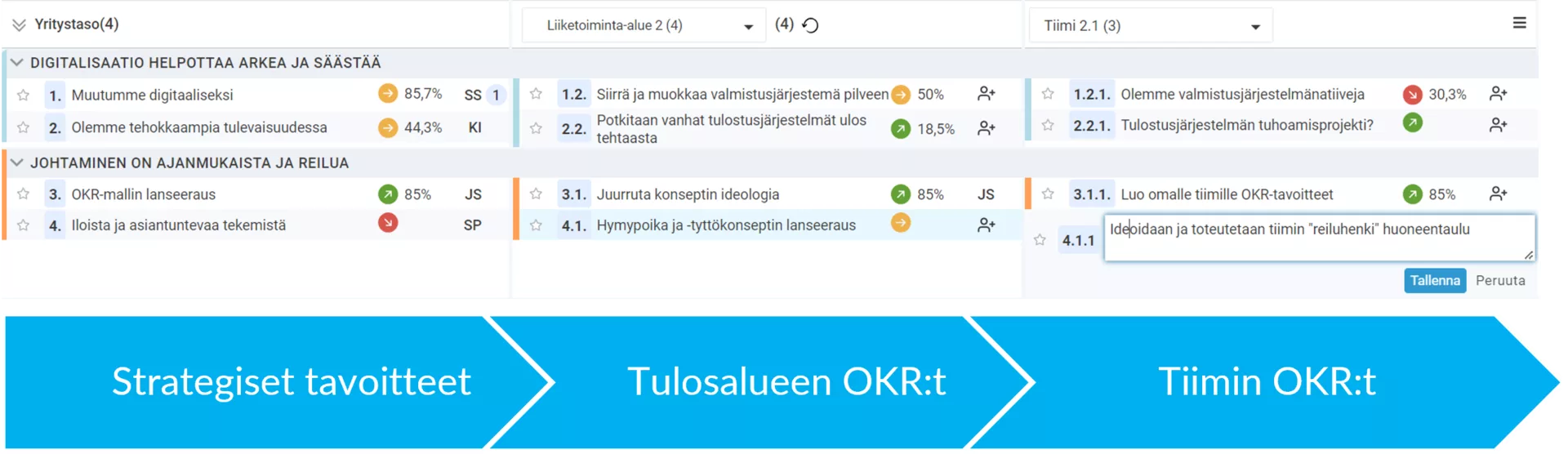 Strategian toteutuksen kulmakivi OKR-mallilla on se, että OKR tavoitteet ja avaintulokset linkittyvät yhteisiin valintoihin ja strategisiin tavoitteisiin