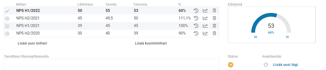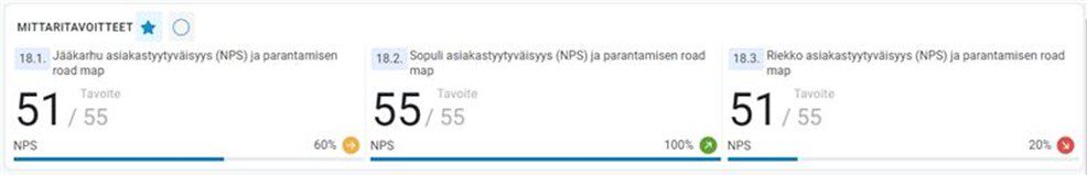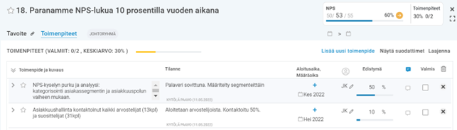 Hyvä organisaatiotason strateginen tavoite voisi olla vaikkapa nostaa suosittelijoiden määrää 10 % vuosittain. Mittarina voidaan käyttää NPS-lukua, jota kannattaa seurata vähintään puolivuosittain, mieluummin jopa kvartaaleittain tai useammin, jos tuotteenne mahdollistaa datan keräämisen vaikkapa suoraan palvelussanne toteuttavilla pikakyselyillä. Kalenteroikaa ja toimenpiteistäkää siis teille sopiva kyselyväli ja huomioikaa myös varata aina aikaa kulloisenkin kyselyn tulosten purkuun ja analyysiin.